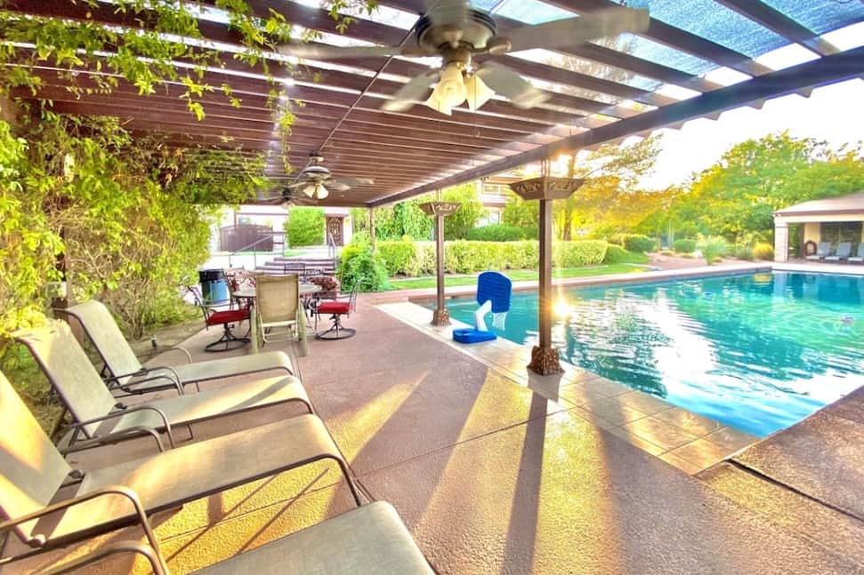 Set on 2.5 gated acres, this 10 bedroom estate offers an 8ft deep pool, tennis court, basketball courts, spacious living areas and a private casita. With over 6,600 square feet, a large game room and quick access to the Strip, this home is ideal for family gatherings, retreats and group getaways. Click here to book.