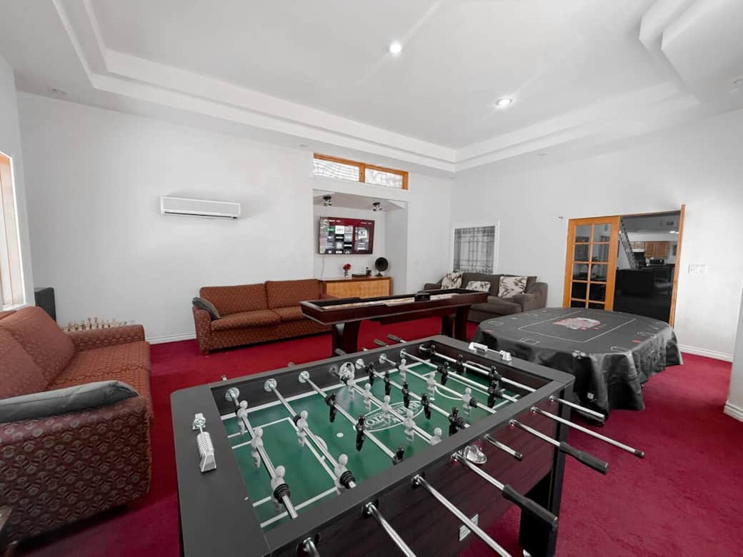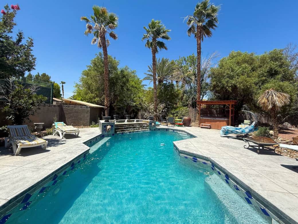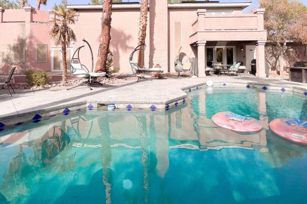 Your perfect alternative in Las Vegas to alleviate exposure to the crowds. A private, gated, full-acre lot includes 2 homes: a two-story with 6 bedrooms and a one-story with 4 bedrooms. With a very large cul-de-sac, there's plenty of parking space. Surrounded by lush tropical landscaping, the estate provides plenty of shade and serenity. Please note, this is not a party house - thank you for respecting the peaceful atmosphere. HIGHLIGHTS: ✓ Central location with quick access to the Strip (5-minute drive) and major venues like the New Stadium, Event Center, Mandalay Bay, and the Orleans. ✓ Ideal for corporate retreats, business seminars, film productions, family reunions, sports teams, and more. ✓ Safe and secure grounds, perfect for gatherings with ample parking for RVs and trailers. ✓ Custom swimming pool, 8-person outdoor hot tub, and an oversized BBQ area. Two of Everything! Two homes, two full kitchens, two dining rooms, two living rooms, and two backyards with outdoor spaces. Perfect for large groups, families, or friends traveling together—ideal if the girls want their own space separate from the guys. It’s great for multi-family vacations, corporate retreats, or sports teams where everyone can enjoy their own space while staying connected. Main House Amenities: ✓ 6 bedrooms in the two-story home. ✓ Spacious 25' x 35' Grand Room, perfect for business meetings or reunions. ✓ Vaulted ceilings, faux fireplace, Texas Hold’em poker table, full-size pool/ping-pong table, and high-speed wireless internet. ✓ 60" flat screen TV in the family room, with additional TVs in most bedrooms. ✓ 1st-floor Master Suite: Two-person walk-in granite shower, Jacuzzi tub, and access to an extra-large private terrace. ✓ 2nd-floor Master Suite: Spacious room with private balcony and mountain views, shared bath. Four-Bedroom Home: ✓ Master bedroom with private bath. ✓ Full kitchen and large flat-screen TV in the entertainment room. ✓ Additional sitting room and putting green. ✓ Two full baths Additional Features: ✓ 50-person meeting room. ✓ Spacious kitchen with granite countertops, island sink, and pass-through peninsula. ✓ Quick access to the airport (10 minutes) and Las Vegas Convention Center (15 minutes). FIRST HOUSE (Two-Story) 6 bedrooms, 4 bathrooms, 7 beds + baby crib (Event room, loft with billiards, and pool in the backyard) • Downstairs Master Bedroom 1: King bed, en-suite Full Bathroom (#1) • Upstairs Master Bedroom 2: King & Queen beds, balcony • Upstairs Bedroom 3: King bed • Upstairs Bedroom 4: King bed • Upstairs Full Bathroom (#2) • Downstairs Bedroom 5: Queen bed • Downstairs Full Bathroom (#3) • Downstairs Bedroom 6: Queen bed & baby crib, en-suite Half Bathroom (#4) SECOND HOUSE (One-Story) 4 bedrooms, 2 bathrooms (Putting green & tiki bar in the backyard) • Master Bedroom 7: King & Twin beds, en-suite Full Bathroom (#5) • Bedroom 8: Queen bed • Bedroom 9: Queen bed • Bedroom 10: Queen bed • Full Bathroom (#6) - FREQUENTLY ASKED QUESTIONS - WHAT TIME IS CHECK-IN AND CHECK OUT? Check in is after 4p.m. local time, and check out is 11a.m. WILL I NEED TO MEET THE HOST TO GET A KEY? The property has keyless locks. This keyless system allows entry into the vacation rental through the issue of a “code” rather than a physical key. DO YOU PROVIDE DAILY CLEANING SERVICE? A departure clean is included for all stays. A mid-week or mid-stay clean can be provided for an additional fee. WHAT IS PROVIDED WITH MY ACCOMMODATIONS? All of our vacation rentals are furnished and have a kitchen with amenities including a microwave, coffee maker, toaster and blender. Each property is stocked with cooking and serving items including plates, bowls and utensils, as well as a can opener, corkscrew measuring spoons and more. The coffee maker takes ground coffee and we also offer a spice rack, salt and pepper. There are bath towels, pool towels and bed linens. We also provide an initial supply of trash liners, toilet paper, hand soap and dishwasher soap. Bathrooms are stocked with Shampoo, conditioner and liquid body wash. Laundry facilities are also equipped with laundry soap and dryer sheets. CAN I SHIP A PACKAGE TO MY VACATION HOME? We do not recommend shipping directly to the home and there are many different people with access to the home: vendors, housekeeping, Guest Services staff, other guests during their stay, etc... so we cannot be responsible for packages once delivered. DO YOUR HOMES HAVE OUTDOOR MUSIC SYSTEMS? It’s a city wide strict rule, strongly enforced, no outdoor music and quiet hours after 9pm. Music can be played indoors with the doors and windows closed and sound contained inside. DO YOU ALLOW PETS? Our vacation rentals are pet friendly. We allow for up to two pets per property for a fee of $250 per stay. IMPORTANT NOTES: ➣ We want for you and all your guests to enjoy everything the home has to offer, inside and out, but respectfully ask that no music is played outdoors in order to not disrupt our neighbors. ➣ Fireplaces - for your safety and the city license, fireplaces are for decoration only. ➣ We can accommodate your family and large groups up to possibly 22 people! Just ask. Extra fees may apply for groups and/or families over 14 people. Please inquire. (No parties, no weddings, no loud groups, no smoking inside)